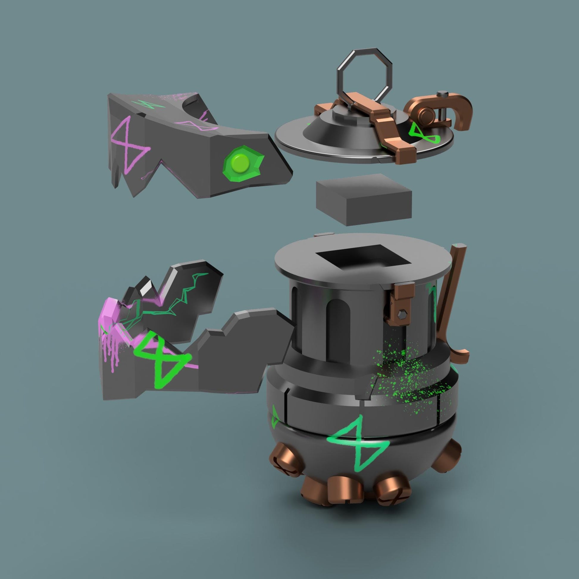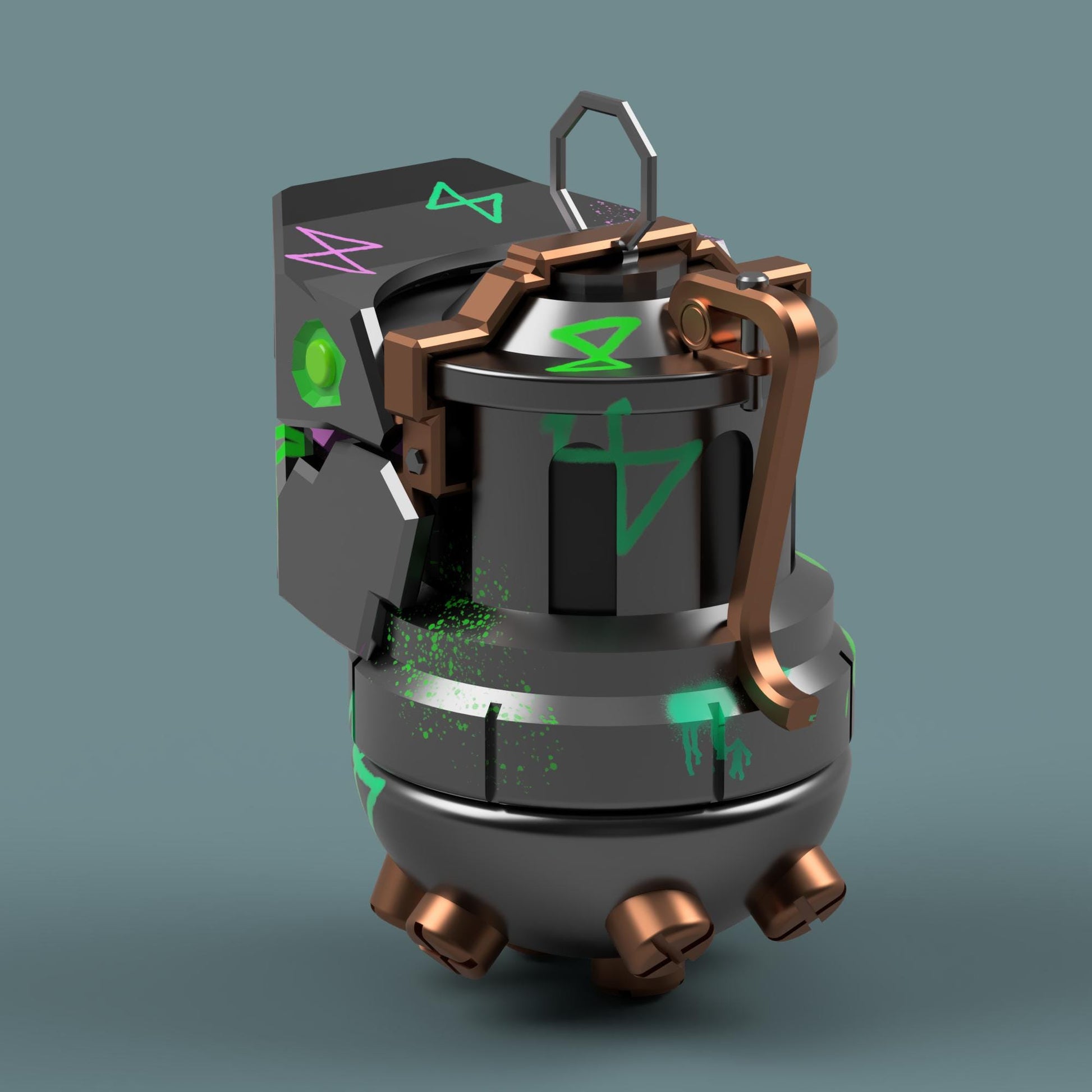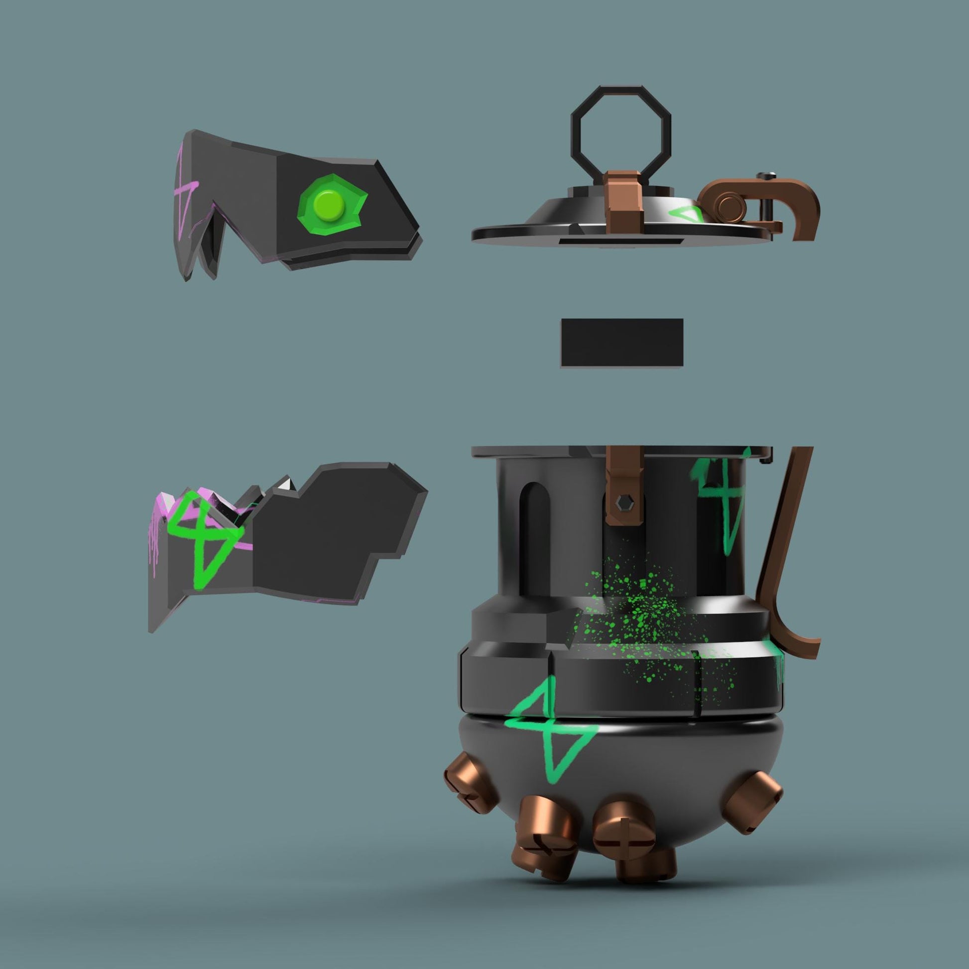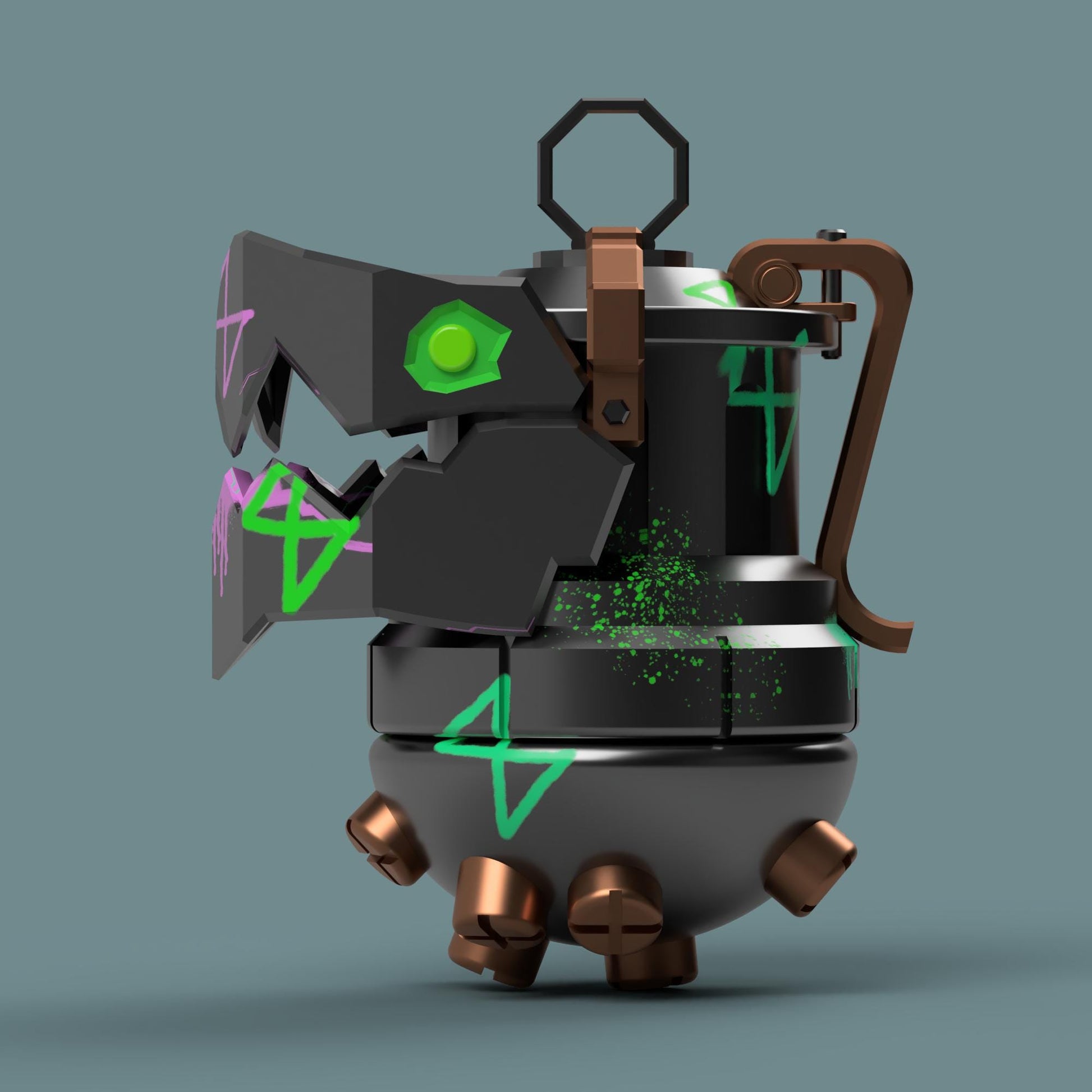 This is a 3D printable version of Jinx's grenade, Chomper. The files come disassembled to make printing easier with slots and pegs that allow for the pieces to be slotted together easily after printing.